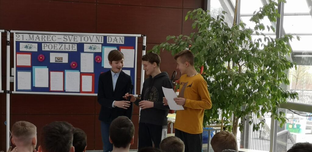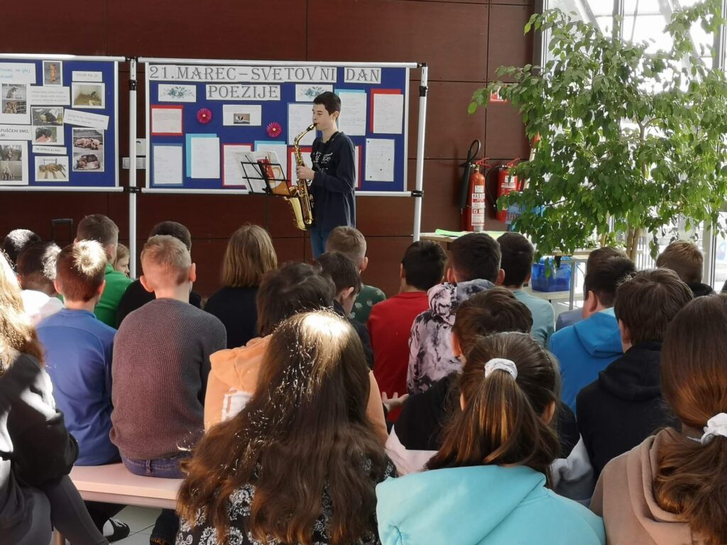 Tudi na naši šoli smo ta dan del pouka namenili poeziji. Učenci so se prelevili v prave pesnike – deklamirali so svoje avtorske pesmi ter pesmi različnih avtorjev, prav tako so se predstavili z glasbenim ustvarjanjem.