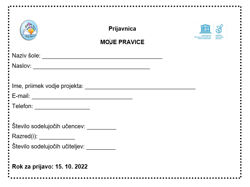 Vsak človek na svetu se rodi z enakimi pravicami, ne glede na njegovo nacionalnost, spol, etično pripadnost, politično prepričanje, raso, vero, jezik… Izhodišče globalnega učenja predstavljajo človekove pravice, ki se jih je treba učiti zaradi ustvarjanja pravičnejšega sveta, v katerem bo človek lahko ohranjal dostojanstvo, lastno vrednost, enakost in spoštovanje raznolikosti. Medkulturni dialog je eden izmed ključnih pogojev za bivanje na skupnem planetu. Človekove pravice so torej tema, ki nas bo povezovala v nacionalnem Unesco ASP projektu MOJE PRAVICE. Pomembno je, da mladi poznajo človekove pravice in z njimi tudi povezane odgovornosti, da jih razumejo in predvsem udejanjajo v vsakdanjem življenju.