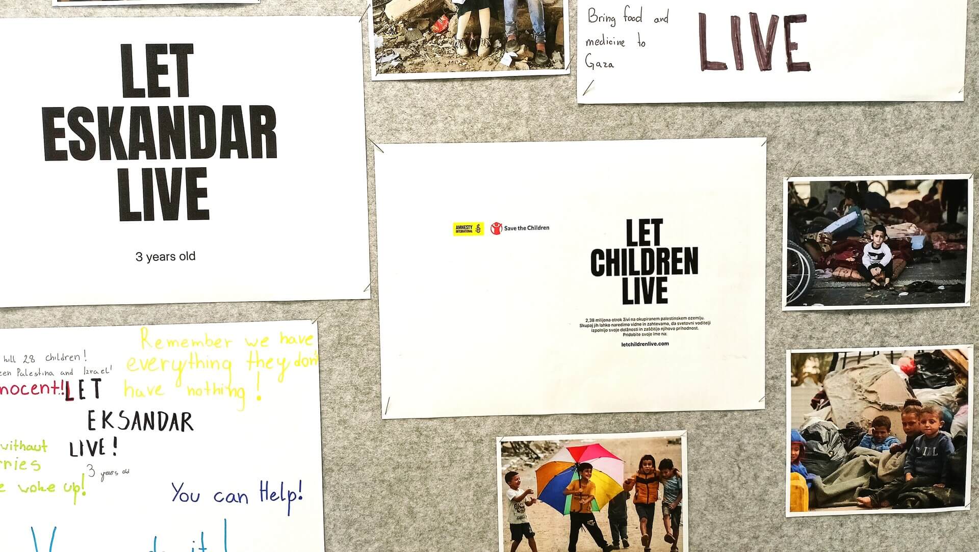 Palestinski otroci odraščajo v neznosnih razmerah. Okupirana Gaza je zdaj za otroke najbolj smrtonosno mesto na svetu. Vsak dan jih v povprečju umre 28. Medtem ko svet opazuje, se nasilje pod nezakonito okupacijo izraelskih oblasti nadaljuje. Kampanja LET CHILDREN LIVE je globalni poziv k dejanjem. Z njo želimo spomniti sebe in drug drugega, da je še vedno negotova prihodnost vsakega izmed 2,38 milijona palestinskih otrok, ki se danes borijo za preživetje na okupiranem palestinskem ozemlju. Poleg spominjanja na tisoče ubitih palestinskih otrok in izgovarjanja njihovih imen, moramo prepoznati tudi pravice tistih, ki živijo. Ne bomo dovolili, da ti otroci postanejo zgolj statistika. Izgovorili bomo njihova imena in zahtevali bomo, da so oni in njihove pravice zaščiteni.