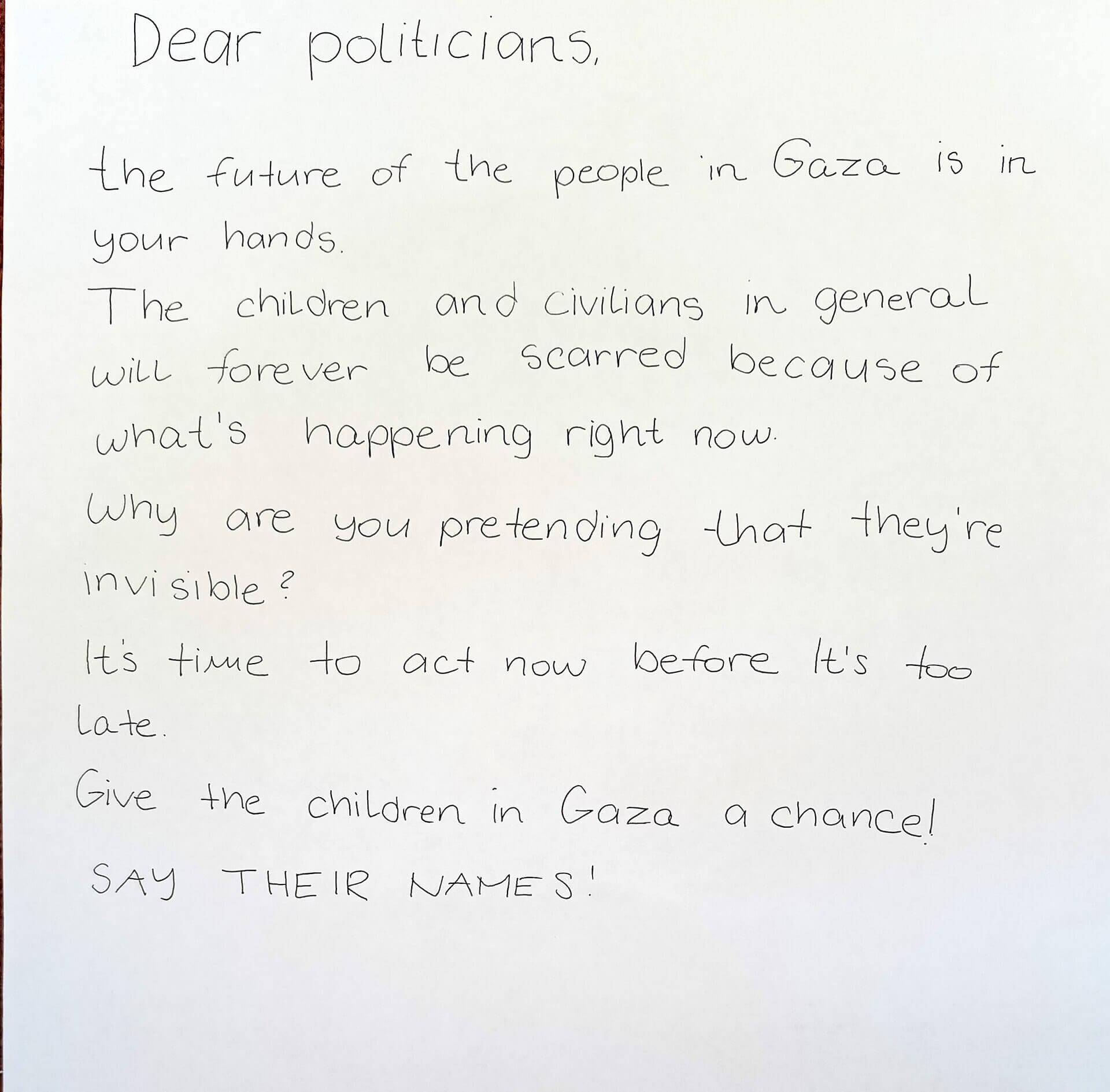 13. septembra, v soboto pred rokom, ki ga je določila Generalna skupščina Združenih narodov za končanje izraelske nezakonite okupacije, bodo ljudje po vsem svetu prišli na ulice ali na spletu podprli akcijo. Vsak z imenom svojega palestinskega otroka, ki se bori za preživetje in življenje pod izraelsko brutalno okupacijo. Vsako ime predstavlja življenje in prihodnost, ki jo moramo zaščititi. Vsak otrok ima pravico odraščati v varnosti in živeti življenje brez bomb, lakote, nasilja, diskriminacije in krivic. Skupaj bomo dvignili glas za vse palestinske otroke, ki živijo pod nezakonito okupacijo izraelskih oblasti, pod blokado in nenehnimi grozodejstvi. Pozivamo torej slovenske oblasti in mednarodno skupnost, da ukrenejo vse, kar lahko, da se: