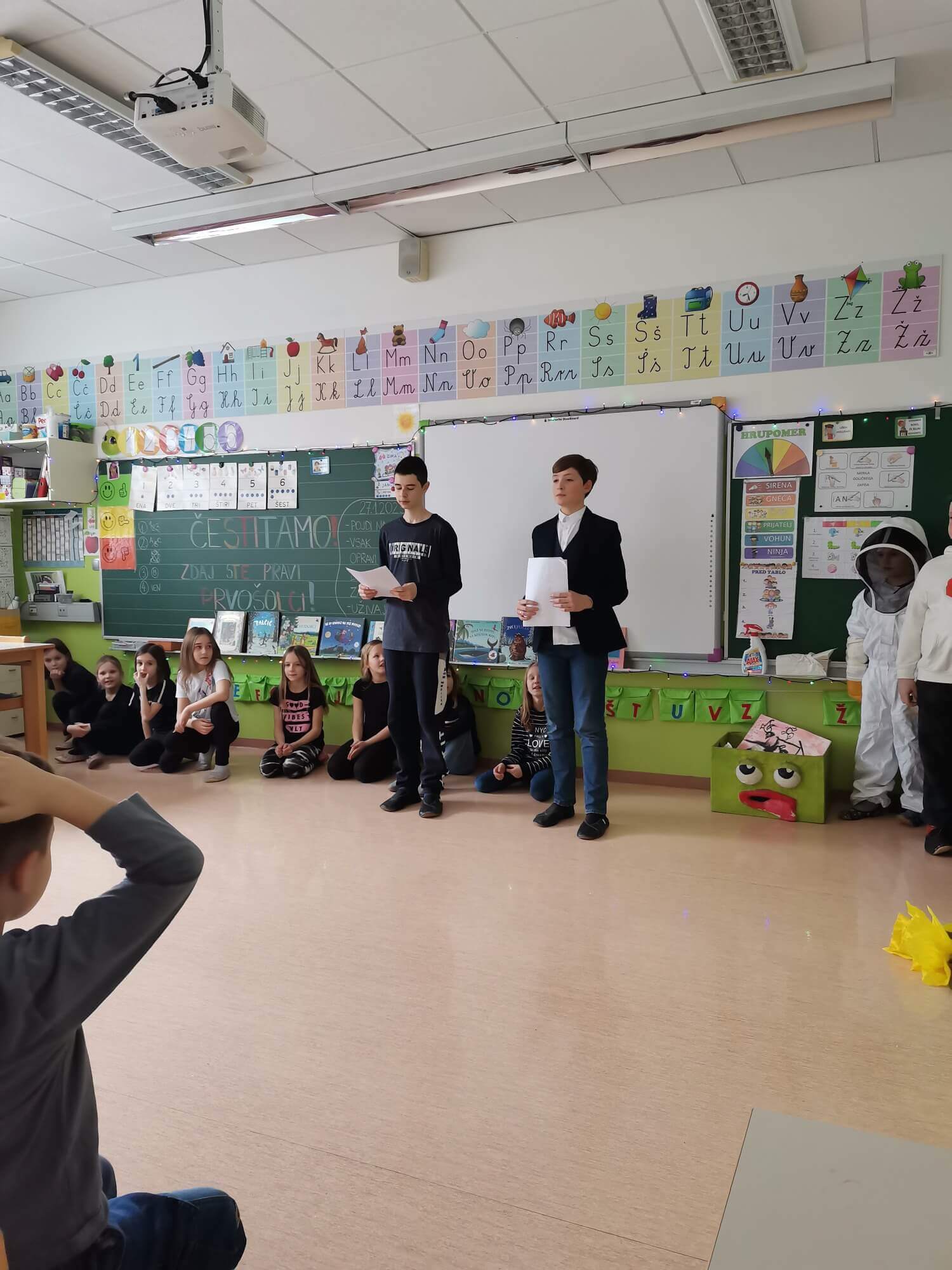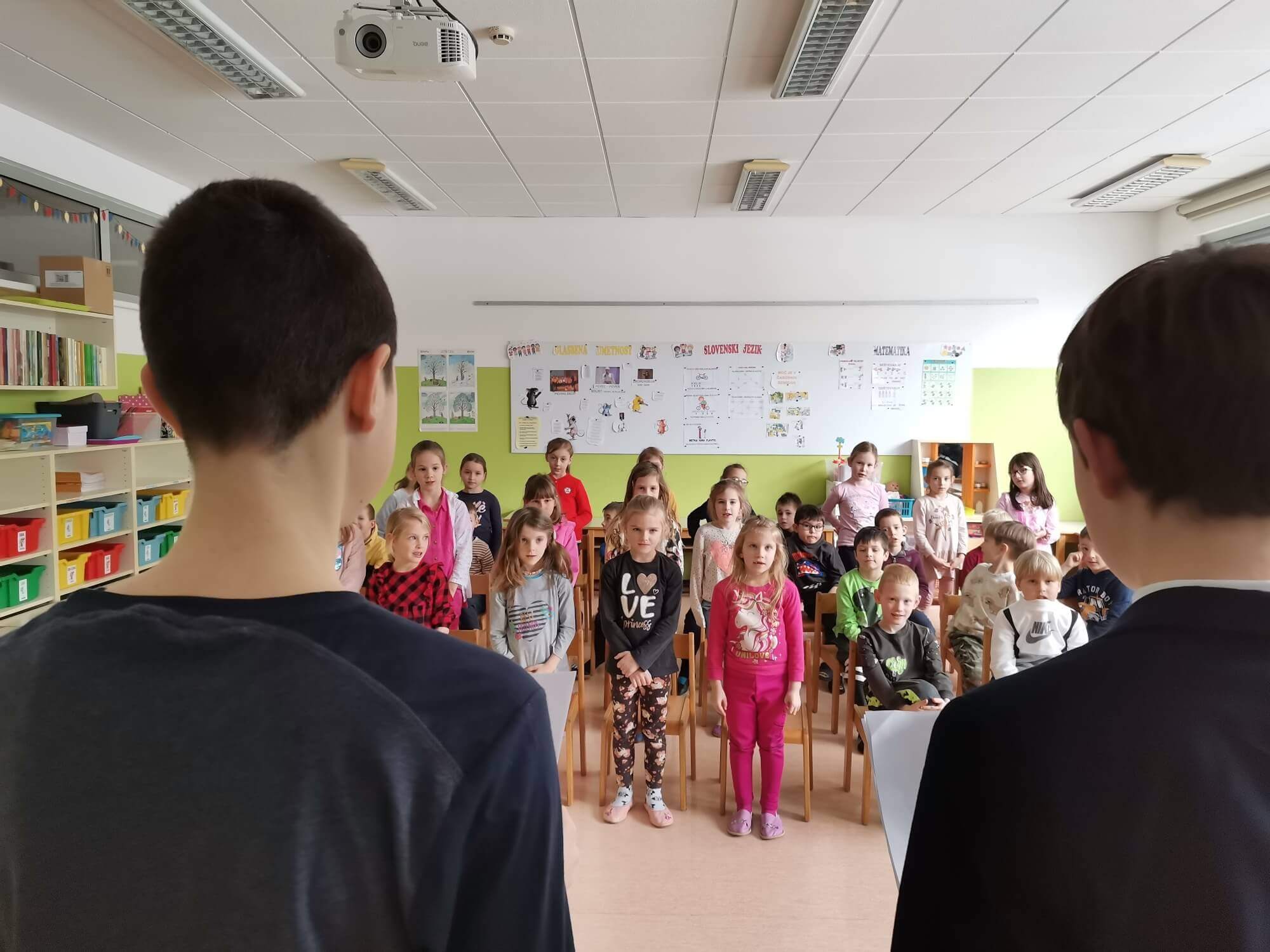 Učenci 1. a in 1. b razreda so se s svojimi učiteljicami zbrali v lepo urejeni učilnici. Ogledali so si kratek program, ki so ga pripravili učenci 3. a razreda. Prvošolci so na prireditvi zapeli in s tem poskrbeli za še prijetnejše vzdušje. S svečano prisego pa so obljubili, da bodo vzorni učenci in pomemben del šolske skupnosti. Ob koncu prireditve sta predstavnika šolske skupnosti Lev in Jaka, ki sta program vodila, učencem čestitala in jim zaželela lepe počitnice. Prireditve so se udeležile tudi ga. ravnateljica Kristina Radoš Janežič in mentorici šolske skupnosti Eva Ambrož Hažič in Barbara Žgajner.