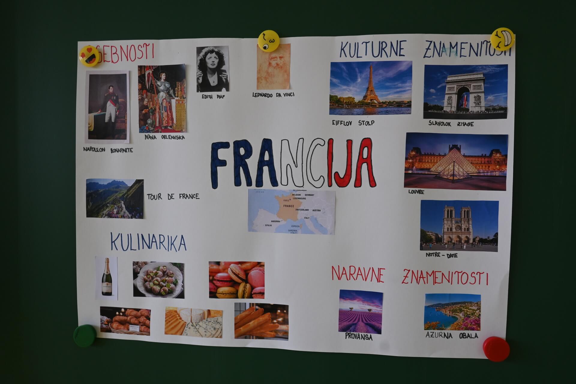 Učenci so spoznavali značilnosti Francije in življenje v tej državi. Učenci od 6. do 9. razreda so sodelovali v 12 različnih delavnicah, ki so jih zanje pripravili naši učitelji. Izdelovali so zgibanke o Franciji, francosko–angleško–slovenski slovar, francoske slaščice, maketo Eifflovega stolpa ter geografske karte, raziskovali pa so tudi znane športnike iz tega dela Evrope.